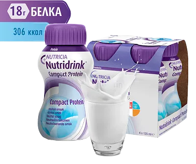 Постепенный переход к обычному рациону. Преимущество отдавать белковым продуктам. Специализированное питание Нутридринк 200 мл и Нутридринк Компакт Протеин 125 мл